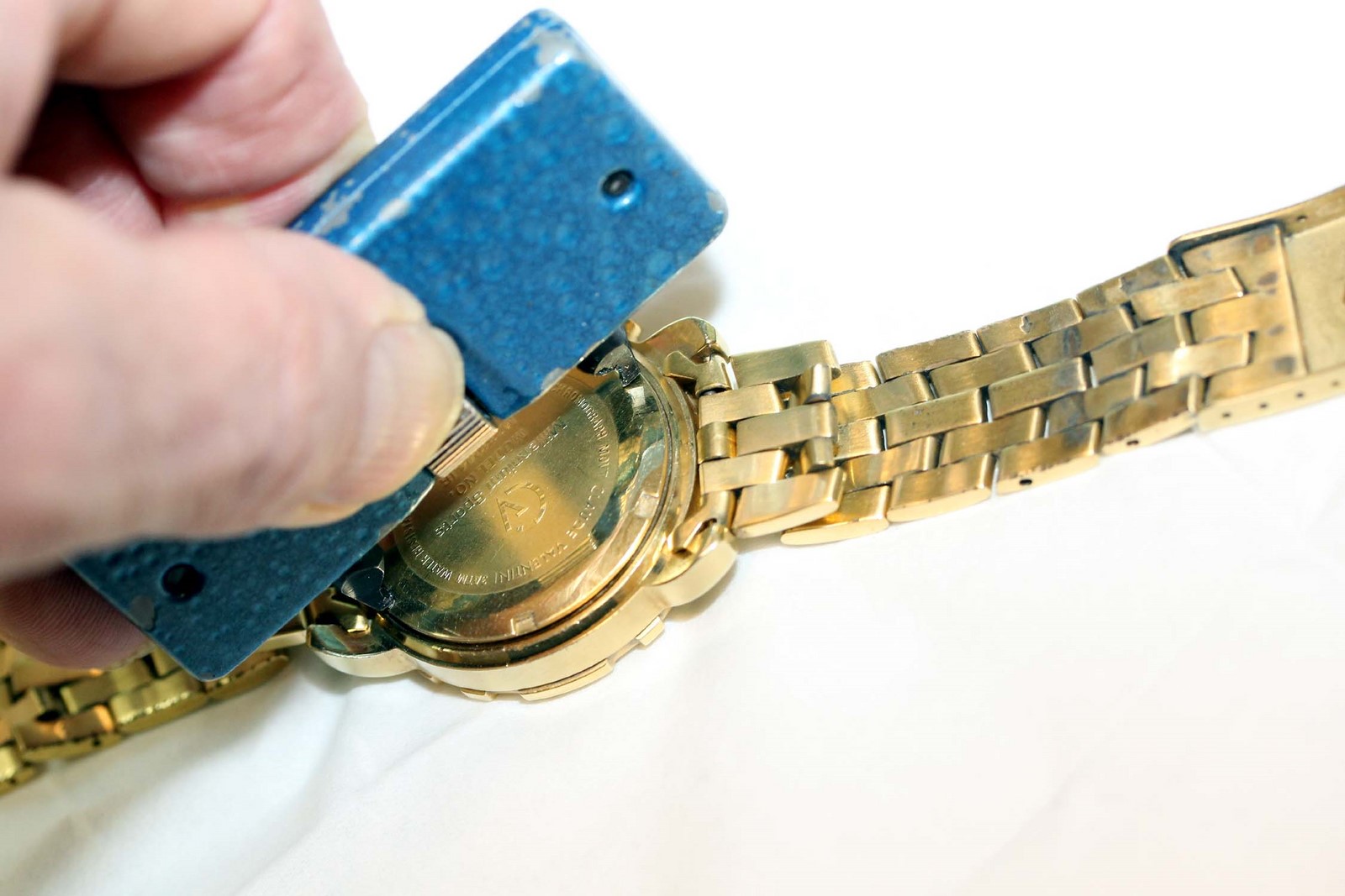Die Uhr habe ich dabei mit einer Hand und den Gehäuseöffner in der anderen Hand gehalten.