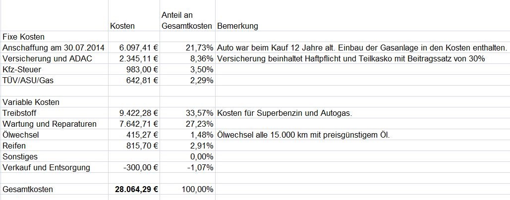 Die seit der Anschaffung des Autos im Mai 2008 bis zum Verkauf im Oktober 2014 angefallenen Autokosten für das Auto habe ich in der nachfolgenden Tabelle zusammengestellt. Alle Preisangaben beinhalten die gesetzlichen Steuern.