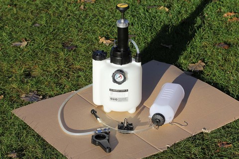In den Behälter des Bremsenentlüftungsgerätes füllte ich ca. 2 Liter neue Bremsflüssigkeit. Den Deckel des Bremsenentlüftungsgerätes habe ich fest und mit Gefühl, also auch nicht zu stark, aufgedreht