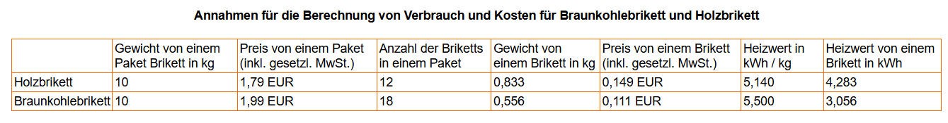 Annahmen für die Berechnung von Verbrauch und Kosten für Braunkohlebriketts und Holzbriketts