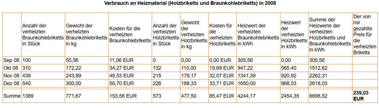Die von uns, von September 2008 bis Dezember 2008, verheizte Menge an Holzbriketts und Braunkohlebriketts habe ich mir notiert.