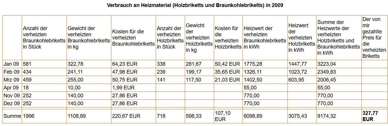 Die von uns, von Januar 2009 bis Dezember 2009, verheizte Menge an Holzbrikett und Braunkohlebrikett habe ich mir notiert.