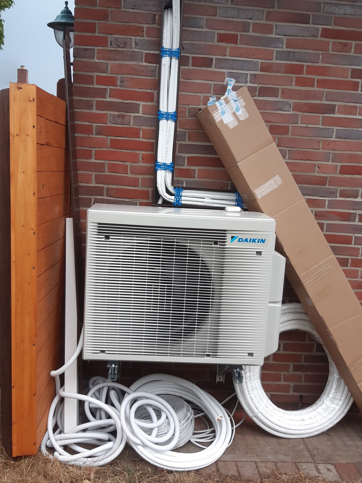 - Das Außengerät wurde installiert. Dazu wurde eine Wandkonsole montiert.