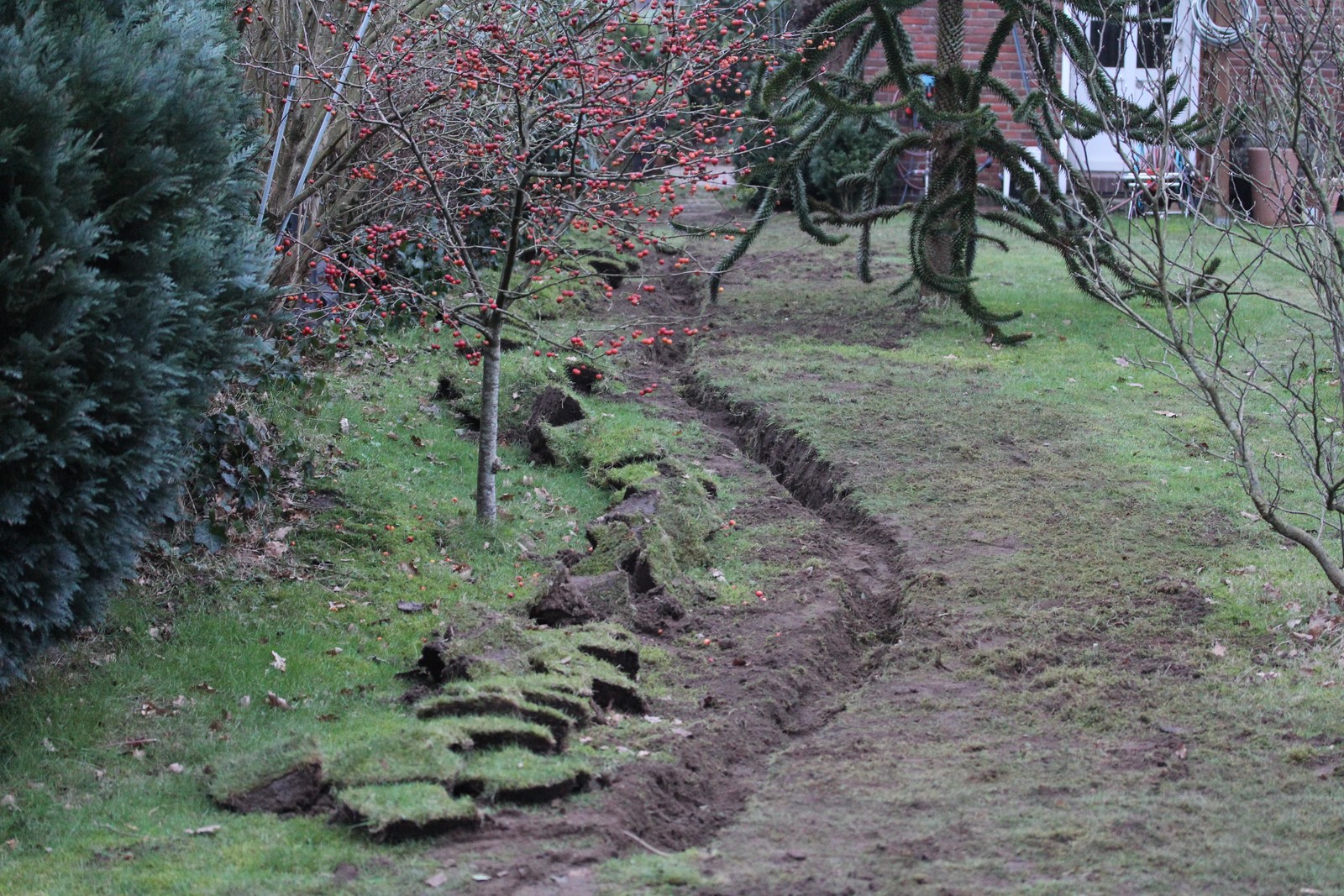 Ich habe einen Graben ca. 60cm tief und so breit wie eine Schaufel gegraben. Die Länge des Grabens war ca. 35 m. Dabei habe ich zunächst die Grasnarbe ausgestochen und auf eine Seite neben dem Graben positioniert. Dann habe ich die schwarze Erde auf der anderen Seiten neben dem Graben positioniert.