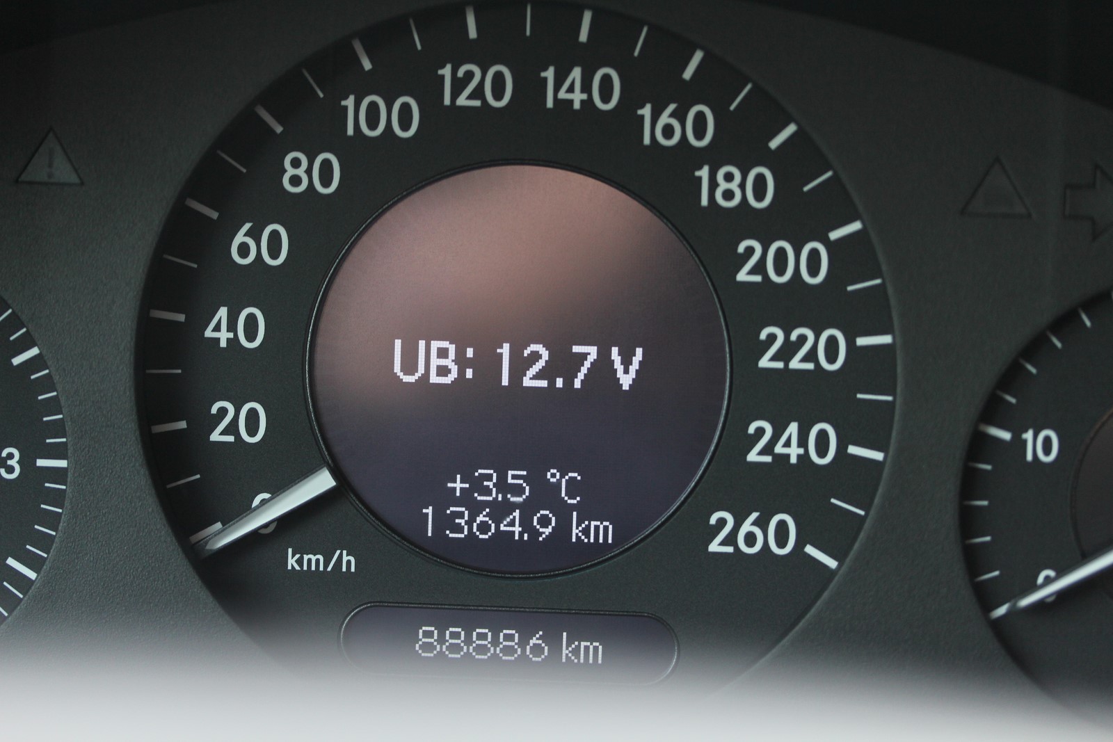 Bei meinem Auto kann ich mir die Bordspannung im Armaturenbrett anzeigen lassen. Die Zündung ist aus. Ich drücke auf die Bremse und schalte die Zündung ein (Zündschlüssel in Stellung eins). Dann drücke ich am Multifunktions-Lenkrad links auf die entsprechenden Tasten, bis im Multifunktions-Display die Temperatur angezeigt wurde. Dann drücke ich dreimal hintereinander jeweils kurz auf den Rückstellknopf (R-Taste) bis es piepte. Jetzt wurde im Multifunktions-Display die Spannung angezeigt.