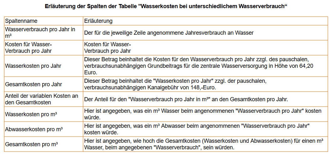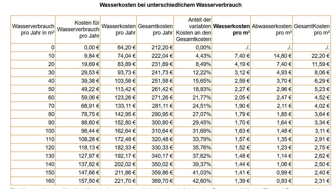 Die Analyse der Wasserkosten zeigt, dass der für einen Kubikmeter Wasser zu zahlende Preis umso mehr sinkt, je höher der angenommene Wasserverbrauch ist. Bei einem angenommenen Wasserverbrauch von 80 m³ wären von uns 3,64 Euro pro m³ zu zahlen. Bei einem doppelt so hohen Verbrauch von 160 m³ wären von uns nur noch 2,31 Euro pro m³ zu zahlen.